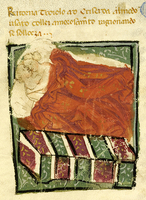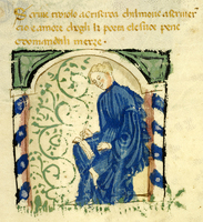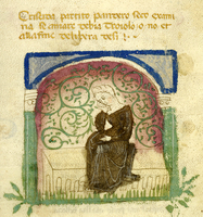 New York, Pierpont Morgan Library, M 371, f. 28v. Il copista del manoscritto, datato ottobre 1414, è Pace di Giuliano da Olibano. L'autore Giovanni Boccaccio si rivolge ad una donna 'ex cathedra'.