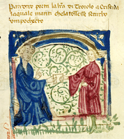 New York, Pierpont Morgan Library, M 371, f. 19v. Il copista del manoscritto, datato ottobre 1414, è Pace di Giuliano da Olibano. Pandaro conferisce con Troiolo; Troiolo si trova da solo.