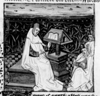 Parigi, Bibliothèque Nationale de France, Fr. 232, f. 100v. Giovanni Boccaccio, seduto in cattedra, conversa con Alcibiade.
