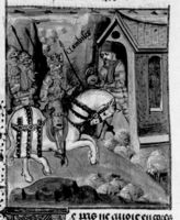 Parigi, Bibliothèque Nationale de France, Fr. 232, f. 82r. Cambise si reca a cavallo in visita al mago Oropaste.