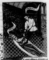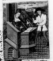 Parigi, Bibliothèque Nationale de France, Fr. 232, f. 68v. L'autore Giovanni Boccaccio seduto su uno scranno, affiancato dalla personificazione della Doppiezza e del Lavoro.