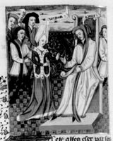 Parigi, Bibliothèque Nationale de France, Fr. 232, f. 61v. Re Candaule mostra a Gige la bellezza della moglie addormentata (qui rappresentata vestita per errore).