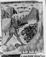 Parigi, Bibliothèque Nationale de France, Fr. 232, f. 67r. Lo scontro tra Tullo Ostilio e Mezio Fufezio (?).