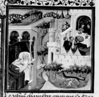 Parigi, Bibliothèque Nationale de France, Fr. 235, f. 67r. Durante un banchetto Nabucodonosor fa massacrare i figli di Sedecia sotto gli occhi del padre; il giovane Sedecia rinchiuso in prigione; l'anziano Sedecia sul letto di morte, assistito da un sacerdote.