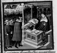 Parigi, Bibliothèque Nationale de France, Fr. 235, f. 113v. L'autore Giovanni Boccaccio siede dinanzi ad un leggio e si rivolge ad un gruppo di legisti.