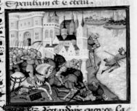 Parigi, Bibliothèque Nationale de France, Fr. 235, f. 144v. Durante lo scontro tra due eserciti a cavallo Alessandro I, re dell'Epiro, viene trafitto da un soldato con una lancia mentre tenta di guadare il fiume Acheronte.