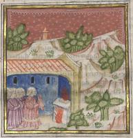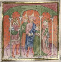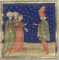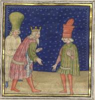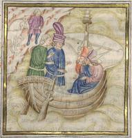 Kassel, Universitätsbibliothek Kassel, Landesbibliothek und Murhardsche Bibliothek der Stadt Kassel, 2° poet. et roman. 3, f. 89v. Due messaggeri inviati dal re parlano con due mercanti sulla loro nave, mentre un servitore li attende a riva con i cavalli.