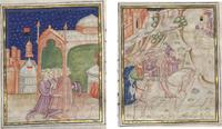 Kassel, Universitätsbibliothek Kassel, Landesbibliothek und Murhardsche Bibliothek der Stadt Kassel, 2° poet. et roman. 3, f. 103v. La carta presenta due miniature: Florio, assunto il nome di Filocolo, offre sacrifici in un tempio di Marmorina insieme ai suoi compagni; lasciata la città, i giovani si dirigono a cavallo verso la nave in attesa, mentre Filocolo si volta per salutare il re.