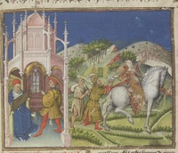 Parigi, Bibliothèque Nationale de France, Fr. 16995, f. 38v. Samuele incorona Saul re di Israele.