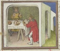 Parigi, Bibliothèque Nationale de France, Fr. 229, f. 16v. Il copista del manoscritto è Boniface de Remenant. Durante un banchetto Atreo serve a Tieste i corpi dei suoi figli.