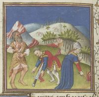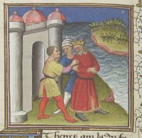 Parigi, Bibliothèque Nationale de France, Fr. 229, f. 14r. Il copista del manoscritto è Boniface de Remenant. Edipo uccide suo padre Laio in battaglia; la regina Giocasta compie il suicidio trafiggendosi con la spada.