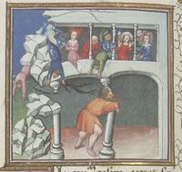 Parigi, Bibliothèque Nationale de France, Fr. 229, f. 36v. Il copista del manoscritto è Boniface de Remenant. Sansone, accecato, spezza le colonne e fa crollare il tetto della sala dove sono riuniti i Filistei.