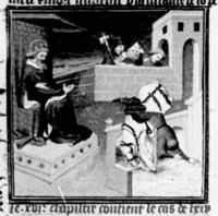 Parigi, Bibliothèque Nationale de France, Fr. 228, f. 354v. Maometto predica da un pulpito ad un gruppo di fedeli; sulla sinistra siede Dio Padre benedicente (rappresentato come un re).