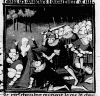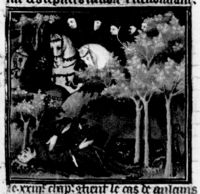 Parigi, Bibliothèque Nationale de France, Fr. 226, f. 267v. Filippo il Bello viene sbranato da un cinghiale durante una battuta di caccia.