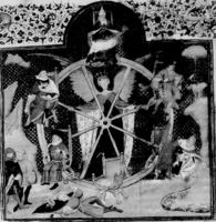 Parigi, Bibliothèque Nationale de France, Fr. 16994, f. 1r. La Fortuna, rappresentata come una regina alata e bendata, gira la ruota che determina le sorti di papi, sovrani e borghesi; ai margini due uomini osservano la scena intimoriti.