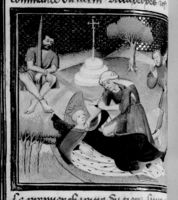Parigi, Bibliothèque Nationale de France, Fr. 226, f. 272r. Filippa da Catania allatta il principe Ludovico nella camera della regina Violante; Roberto e Sancia, figli di Filippa, vengono condotti su un carro al luogo dell'esecuzione, dove vengono arsi vivi sul rogo.