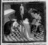 Parigi, Bibliothèque Nationale de France, Fr. 226, f. 268v. Tre uomini vengono uccisi per ordine di Gualtieri di Brienne, duca d'Atene.