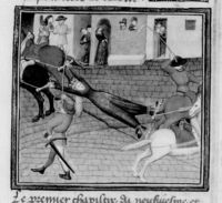 Parigi, Bibliothèque Nationale de France, Fr. 226, f. 262v. Manfredi viene ucciso da Carlo d'Angiò nella battaglia di Benevento.