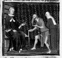 Parigi, Bibliothèque Nationale de France, Fr. 226, f. 264r. Aitone re d'Armenia viene accecato; Sempad (Sabath) viene assassinato; Bonifacio VIII si divora la mano destra.
