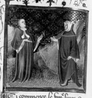 Parigi, Bibliothèque Nationale de France, Fr. 228, f. 312v. Francesco Petrarca appare a Giovanni Boccaccio