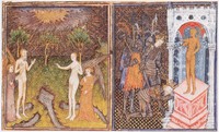 Parigi, Bibliothèque Nationale de France, Fr. 16995, f. 1r. Adamo ed Eva nel Giardino dell'Eden accompagnati da due angeli; Neottolemo (Pirro) uccide re Priamo mentre questi è inginocchiato in preghiera dinanzi a un altare.