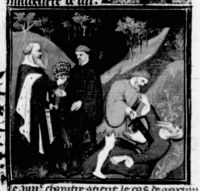 Parigi, Bibliothèque Nationale de France, Fr. 226, f. 257r. L'imperatore Andronico ordina l'assassinio di Alessio II e Maria di Monferrato; un uomo getta in acqua un cadavere avvolto in un sudario; alcuni spettatori assistono all'impiccagione di Andronico.