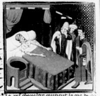 Parigi, Bibliothèque Nationale de France, Fr. 226, f. 222v. L'imperatore Galerio giace a letto morente colpito dalla cancrena, circondato da servitori che si turano il naso per sfuggire al fetore del corpo.