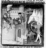 Parigi, Bibliothèque Nationale de France, Fr. 226, f. 234r. Teodorico assedia Ravenna con il suo esercito e fa uccidere Odoacre all'interno delle mura.