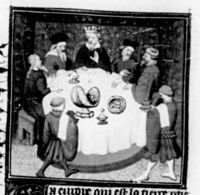 Parigi, Bibliothèque Nationale de France, Fr. 226, f. 237r. Re Artù siede intorno alla Tavola Rotonda con i suoi cavalieri.