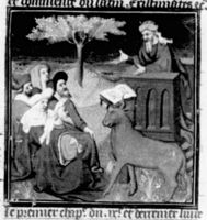 Parigi, Bibliothèque Nationale de France, Fr. 226, f. 243r. Maometto, con la colomba che gli sussurra all'orecchio, predica ad una folla di fedeli seduta dinanzi a lui sul prato, accanto ad un bue con il Corano legato alle corna.