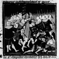 Parigi, Bibliothèque Nationale de France, Fr. 226, f. 256v. La battaglia di Tinchebray tra gli eserciti di Enrico I d'Inghilterra e Roberto II di Normandia.