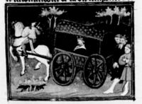 Parigi, Bibliothèque Nationale de France, Fr. 226, f. 117r. Due uomini trascinano Arsinoe fuori dalla città, dove si trovano i corpi dei suoi due figli morti.