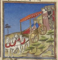 Parigi, Bibliothèque de l'Arsenal, 5193, f. 323v. Zenobia viene condotta prigioniera insieme ad alcuni soldati dietro il carro trionfale di Aureliano.