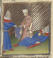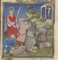 Parigi, Bibliothèque de l'Arsenal, 5193, f. 337r. L'imperatore Valente ordina la persecuzione e il massacro dei Cristiani.