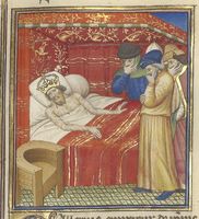 Parigi, Bibliothèque de l'Arsenal, 5193, f. 329r. L'imperatore Galerio giace a letto morente colpito dalla cancrena, circondato da servitori che si turano il naso per sfuggire al fetore del corpo.