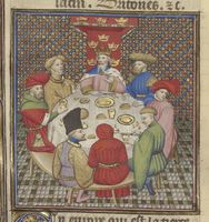 Parigi, Bibliothèque de l'Arsenal, 5193, f. 349v. Re Artù siede intorno alla Tavola Rotonda con i suoi cavalieri.