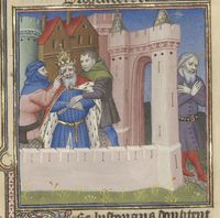 Parigi, Bibliothèque de l'Arsenal, 5193, f. 370r. Carlo Magno fa imprigionare Desiderio, re dei Longobardi, insieme alla sua famiglia.