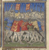 Parigi, Bibliothèque de l'Arsenal, 5193, f. 377r. La battaglia di Tinchebray tra gli eserciti di Enrico I d'Inghilterra e Roberto II di Normandia.