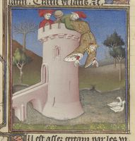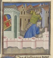 Parigi, Bibliothèque de l'Arsenal, 5193, f. 226r. Giugurta viene gettato dalla rupe Tarpea (rappresentata come una torre).