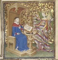 Parigi, Bibliothèque de l'Arsenal, 5193, f. 229r. La Fortuna, raffigurata come una regina bendata e alata con dodici braccia, appare a Giovanni Boccaccio seduto nel suo studio.