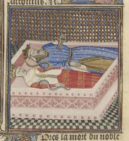 Parigi, Bibliothèque de l'Arsenal, 5193, f. 271r. Due soldati piangono la morte dei loro compagni sul campo di battaglia.