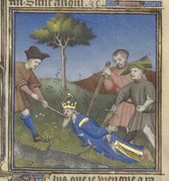 Parigi, Bibliothèque de l'Arsenal, 5193, f. 223r. Re Gripo, seduto sul trono, ordina a due soldati di uccidere Alessandro Zebenna.