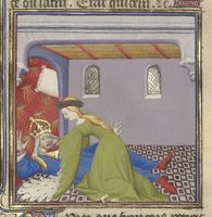 Parigi, Bibliothèque de l'Arsenal, 5193, f. 311r. Francesco Petrarca, coronato di alloro, appare in sogno a Giovanni Boccaccio.