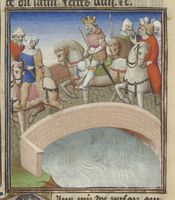 Parigi, Bibliothèque de l'Arsenal, 5193, f. 107r. Serse attraversa a cavallo il ponte sull'Ellesponto con il suo esercito.