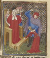 Parigi, Bibliothèque de l'Arsenal, 5193, f. 127r. Annone viene fatto a pezzi e giustiziato al centro di un capannello di spettatori.