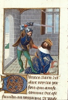 Londra, British Library, Royal 14 E V, f. 139r. Artabano taglia le mani a Serse e si prepara ad ucciderlo.