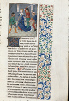 Londra, British Library, Royal 14 E V, f. 233r. Seleuco cade da cavallo; Antioco viene aggredito da tre uomini armati.