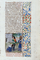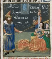 Londra, British Library, Royal 14 E V, f. 217v. Arsinoe tenta di proteggere i figli dal soldato inviato da Cerauno.