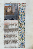 Londra, British Library, Royal 14 E V, f. 291r. L'autore Giovanni Boccaccio siede ad un leggio e conversa con la Fortuna, rappresentata come una dama con sei braccia.