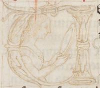 Cambridge (Mass.), Harvard University, Houghton Library, Richardson 41, f. 1v. Una donna ritratta a mezzobusto con un libro, all'interno dell'iniziale figurata S(cripsere); l'iniziale [S] non è stata realizzata.